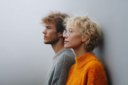 Young man and woman with stylish hair wearing sweaters lean against a gray wall