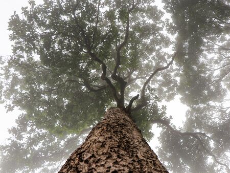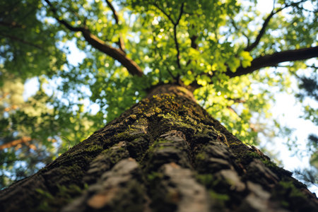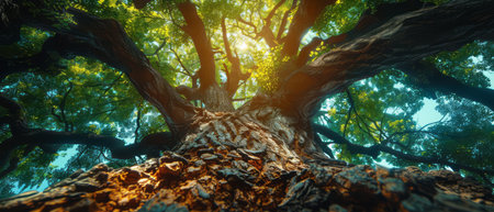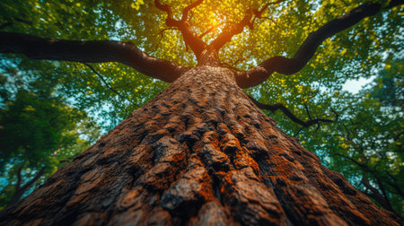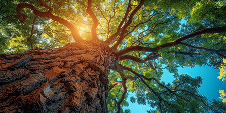 An upward perspective captures a large tree with dense, green leaves reaching towards the sky. The image showcases a textured tree trunk and branches that fill the frame. This natural composition, with overhead lighting, provides a visually appealing look suitable for various commercial or editorial applications.