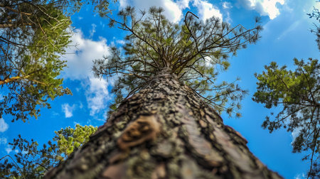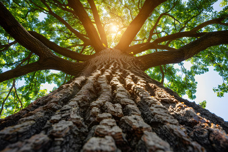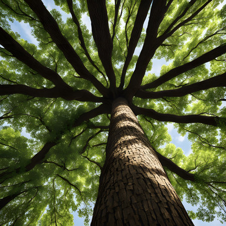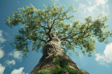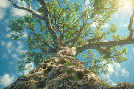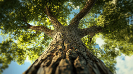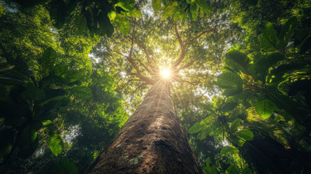 Gaze upwards at the majestic tree reaching for the sun surrounded by vibrant green foliage. A serene scene capturing the beauty of nature and its tranquility.