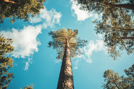 Looking up of pine trees in autumn forest on sunny day at national park