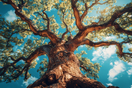 From a low-angle perspective, the immense power and history of an ancient tree are revealed.