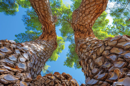Looking Up at Two Tree Trunks Against a Blue Sky