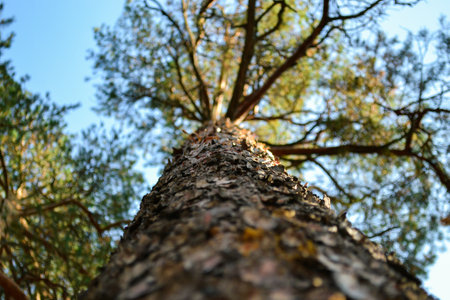 The texture of the trunk of a tall pine against the background of the crown and branches in bokeh. bottom view