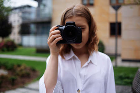 A beautiful girl looks in the viewfinder in the camera, and takes pictures. The blonde learns to photograph and earn money on the photo. A girl photographer walks around the city and takes pictures