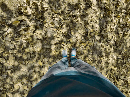 point of view. man sitting on the cliff. legs in blue jeans and white shoes. copy space