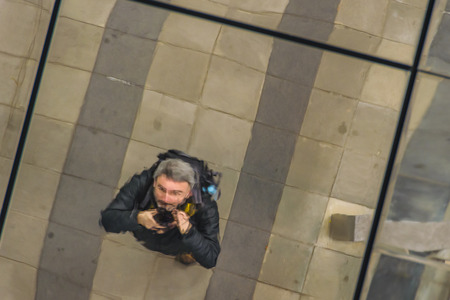TOKYO, JAPAN, JANUARY - 2019 - Adult caucasian man taking an unusual angle perspective selfie