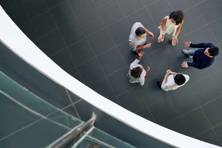 Group of confident business executives standing in circle when discussing new project, view from above