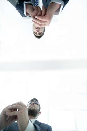 View from below. From behind the glass. Two businessmen sitting at the table.