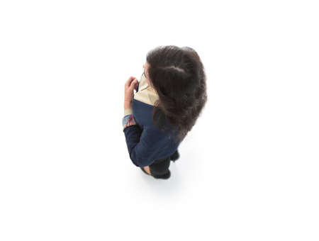 Businesswoman. Full length portrait top angle view isolated on w
