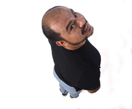 highth angle view of a latin man with his back turned and looking at camera and smiling