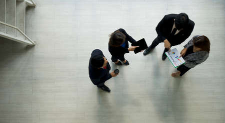 A group of businessmen discussing work in the hall of a modern office. People corporate business team concept. Top View