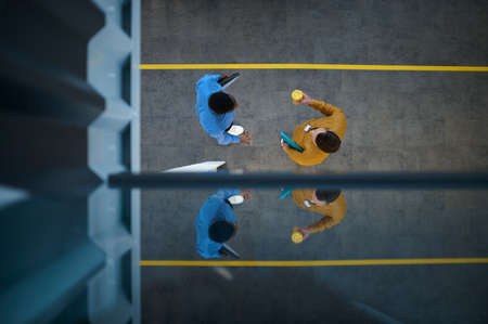 Two managers are talking in IT office, top view