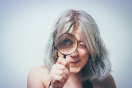 portrait of blond woman looking through a magnifying glass