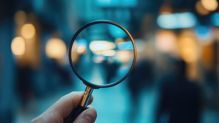 A magnifying glass held up to a blurred background of city lights, symbolizing focus, observation, and exploration.