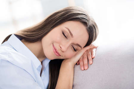 Photo of nice optimistic brunette long hairdo lady lie on coach wear blue shirt alone at home