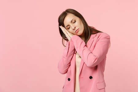 Portrait of relaxed woman wearing jacket keeping eyes closed, sleeping with hands near face isolated on pastel pink background in studio. People sincere emotions lifestyle concept. Mock up copy space