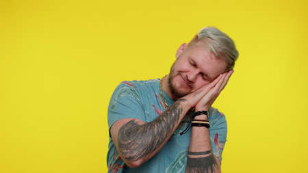A portrait of bearded man in red t-shirt with sleeping gesture. People and emotions concept