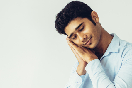 Portrait of tired smiling Indian guy expressing lack of sleep or boredom. Positive young man showing sleep gesture. Sleep deprivation or boredom concept