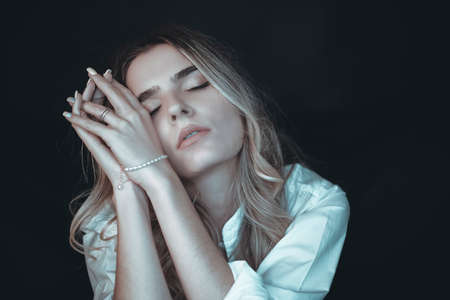 portrait of beautiful Italian girl with long blond hair with closed eyes bracelet and long nails. High quality photo