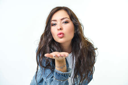 Portrait of a cute beautiful girl. Sends blows a kiss while looking at the camera, Sexy female lips. Separate on a white background. The concept of feelings of affection