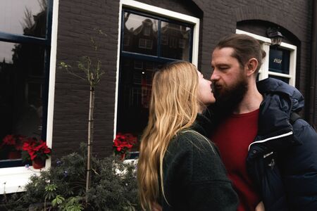 Loving couple man and woman having fun on the streets of Amsterdam in winter warm clothes. Husband looking at wife and smiling . Funny moments of life together. Valentine day concept