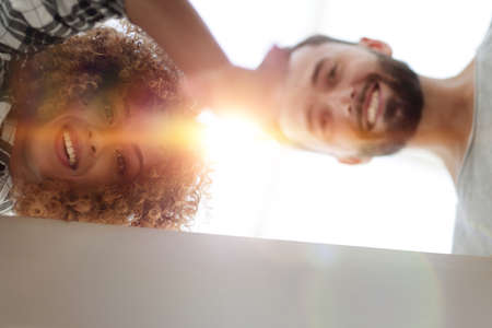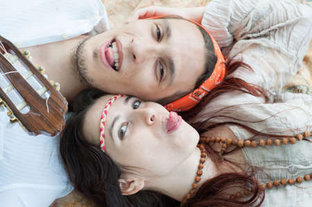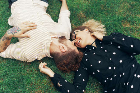 Couple in love lying on the grass in the backyard of their own home. View from the top