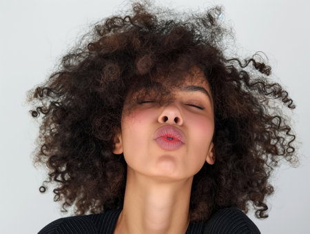 A person with curly hair sending a playful kiss to the camera with closed eyes, on a neutral background.