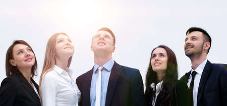 Low angle of a unity group of business people in circle. Happy smiling colleague co-workers. Community of diverse aged and multiracial teamwork. Cheerful teamwork in winter clothes