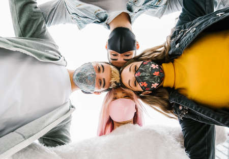 Multiracial milenial friends taking selfie with closed face masks - New normal lifestyle concept with young people having fun together