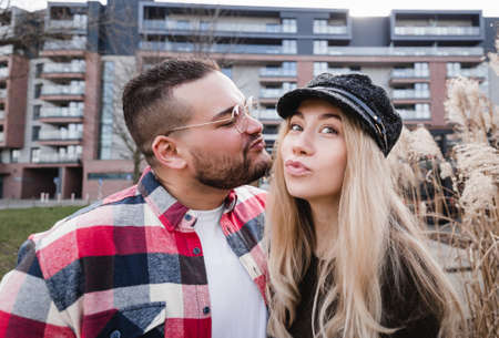 Two lovers making funny selfie, Portrait of cheerful laughing funny young people. Cute couple of hipsters is walking in spring park. Emotion facial expression. Beautiful day.
