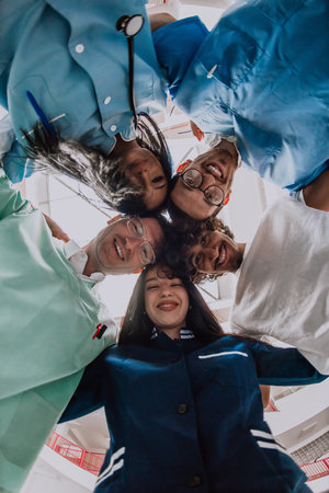 Group of doctors a medical nurse, and a surgeon are captured in a heartfelt embrace, showcasing their unity, teamwork, and profound connection in the healthcare field.