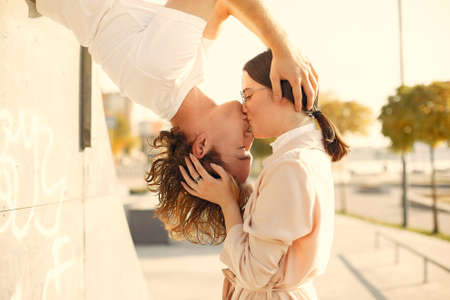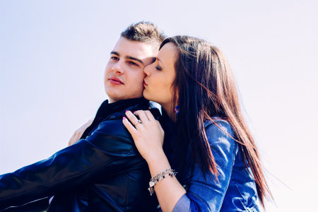 Candid portrait of two young lovers walking outdoors on sunny day. Guy and girl spend time together posing against backdrop bright blue sky. Concept of youth, love and lifestyle.