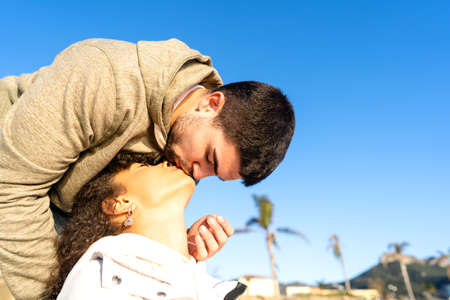 Handsome guy kissing her african-american black girlfriend approaching her mouth from above. Mixed race young couple in love romance vacation scene in sea or ocean resort with copy space in blue sky