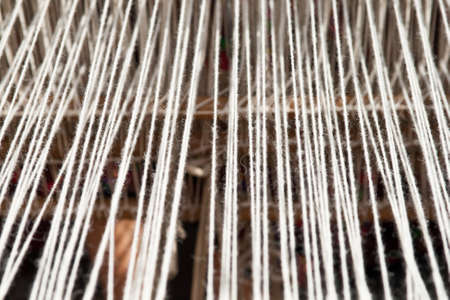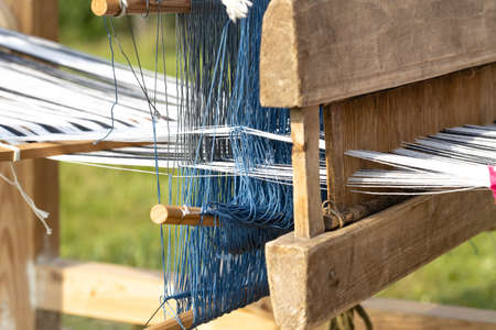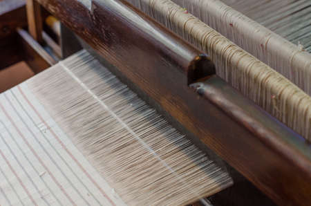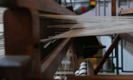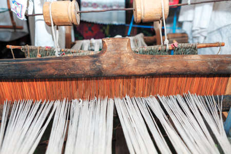 Close-up of ancient traditional hand weaving loom or weaving machine, selective focus