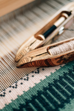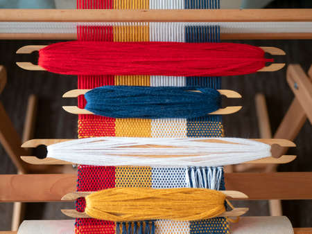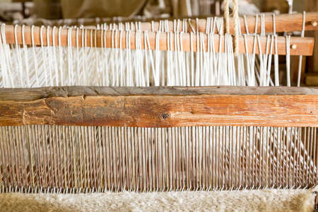 Detail of traditional vintage weaving hand loom with wool close up. Weaving background. Craftsmanship background. Traditional old loom.