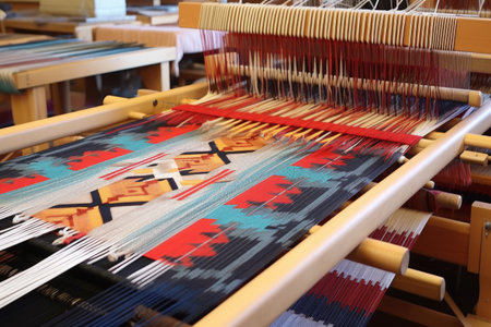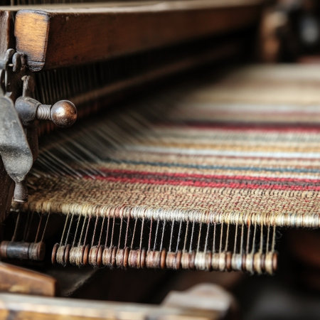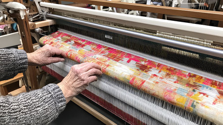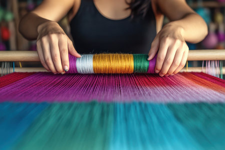 Artisan's hands skillfully manipulate threads on a weaving loom, showcasing craftsmanship and dedication to traditional techniques.