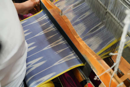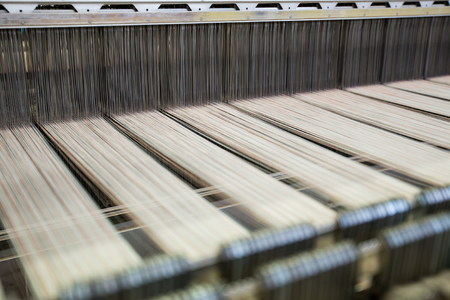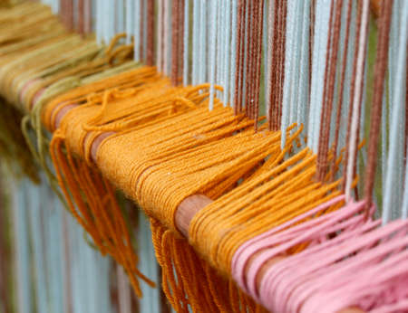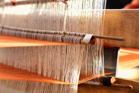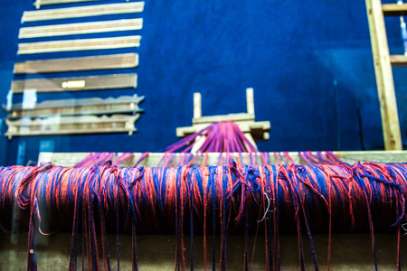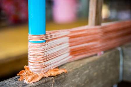 Close up of Thai Silk weaving on a traditional loom. Close up Thai silk thread. Making of thai silk. shallow depth of field