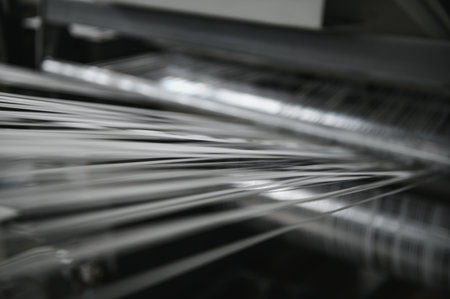 weaving loom at a textile factory, closeup. industrial fabric production line