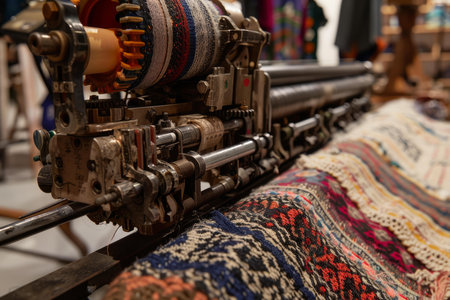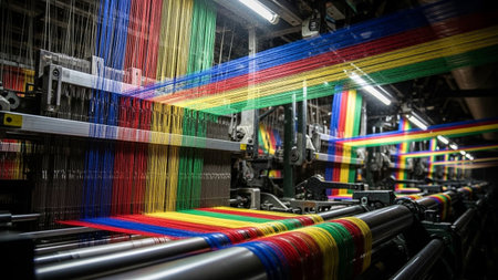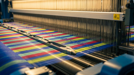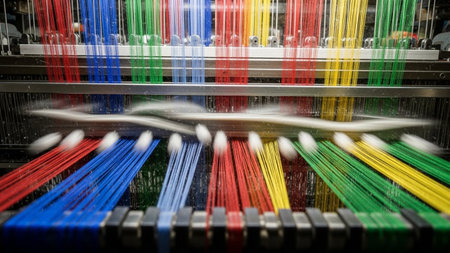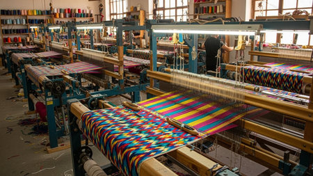 Artisan expertly weaves various colored threads, creating a vibrant textile in a bustling workshop setting.