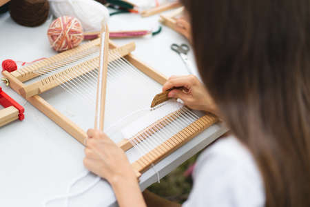 Hands of woman weaving color pattern on traditional hand-weaving wooden loom, Ukraine. Close up