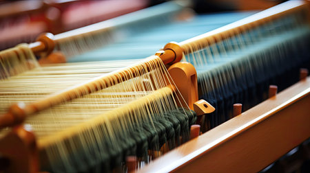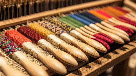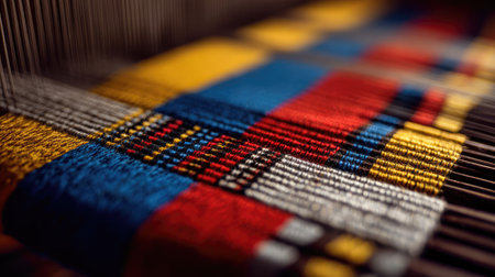 Bright, woven strands in lively hues of gold, crimson, and azure cascade across a handcrafted loom, capturing cultural artistry and rich textile tradition.