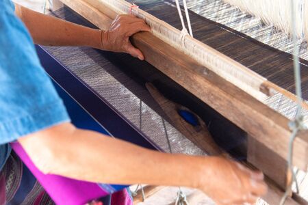 Weaving of cotton from Thailand, cotton weaving in the traditional manner, weaving by ourselves. Selective focus.