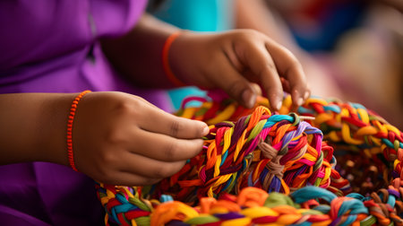 Hands weaving colorful threads on a loom, crafting intricate patterns