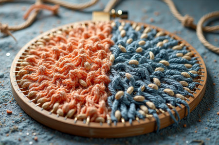 Intricate Weave of Colorful Yarn Strands Enhances Textural Splendor in Cozy Handmade Craft Projects.