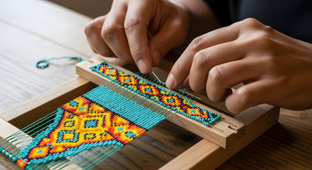 A close-up of a person's hands skillfully weaving a colorful, patterned bracelet with tiny seed beads on a small wooden loom. This image captures the intricate and meditative process of beadwork, a traditional craft and creative hobby.