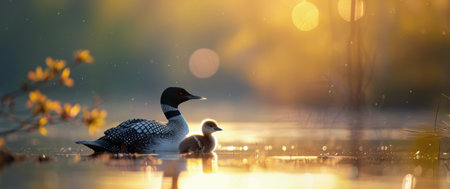 A loon and its chick swim together in a lake at sunrise. The golden light of the dawn illuminates the calm water and creates a beautiful atmosphere. The loon's sleek black and white plumage contrasts sharply with the soft, warm colors of the background.