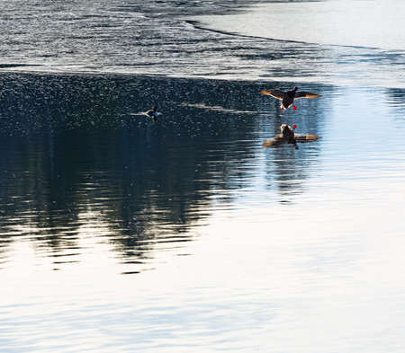 Flying steamer ducks Tachyeres patachonicus in a lagoon.