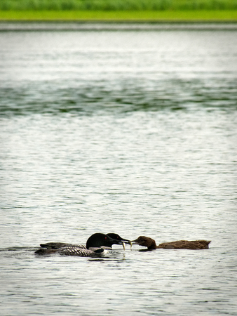 Common loon family or great northern divers - Gavia immer - two adults feeding baby.
