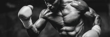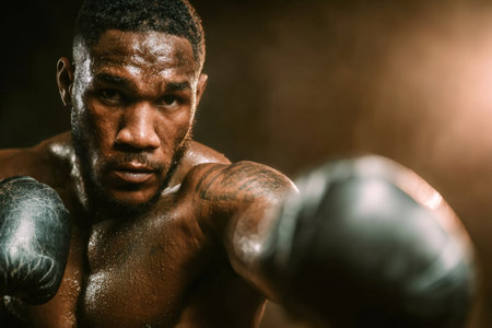 Muscular boxer with intense expression wearing boxing gloves and sweating heavily