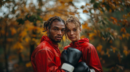 Focused young man and woman clad in red boxing gear train together in a leafy park during a gentle rain, showcasing teamwork and dedication.